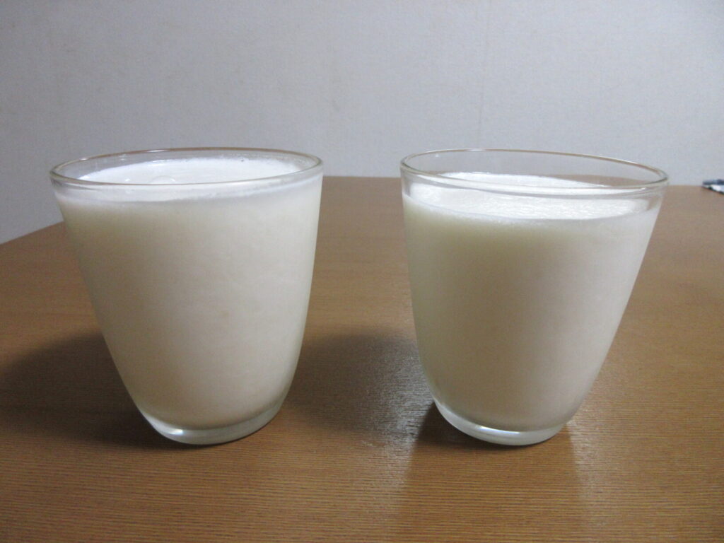 今日はスペシャルドリンク、梨ジュースを作ったんだ!これは、この間、僕が梨を食べながらミルクを飲んだんだ時、奇跡の味が口の中に広がったの! これは、、、と思って、梨とミルク、ついでに蜂蜜を加えてシェイクしてみたんだ。初めてのこころみ! 見た目、きれいなんだけど、本当においしいのかなぁ?