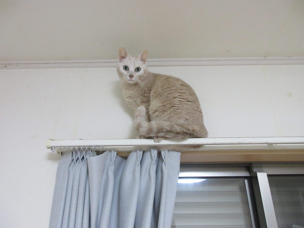 何をやったか?というと、カーテンレールの上に飛び乗って降りられなくなって、ニャーニャーニャーニャー泣いてたの😊